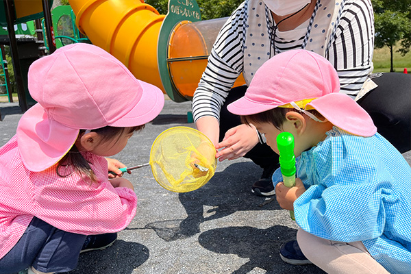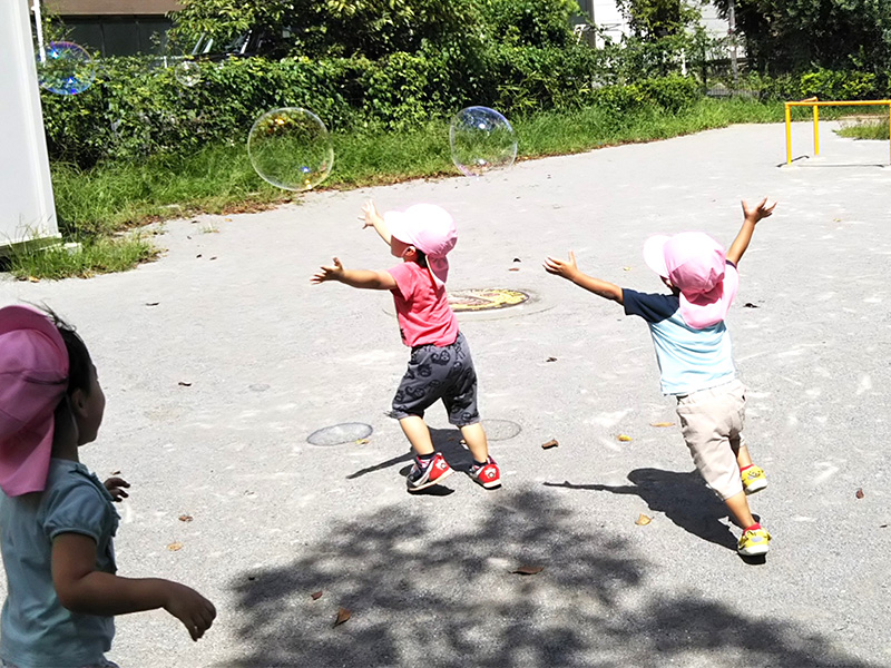 もちろん、雨の日以外は毎日お散歩にも出かけます。外でのびのび自由に遊ぶのも、子どもたちが大好きな時間です。