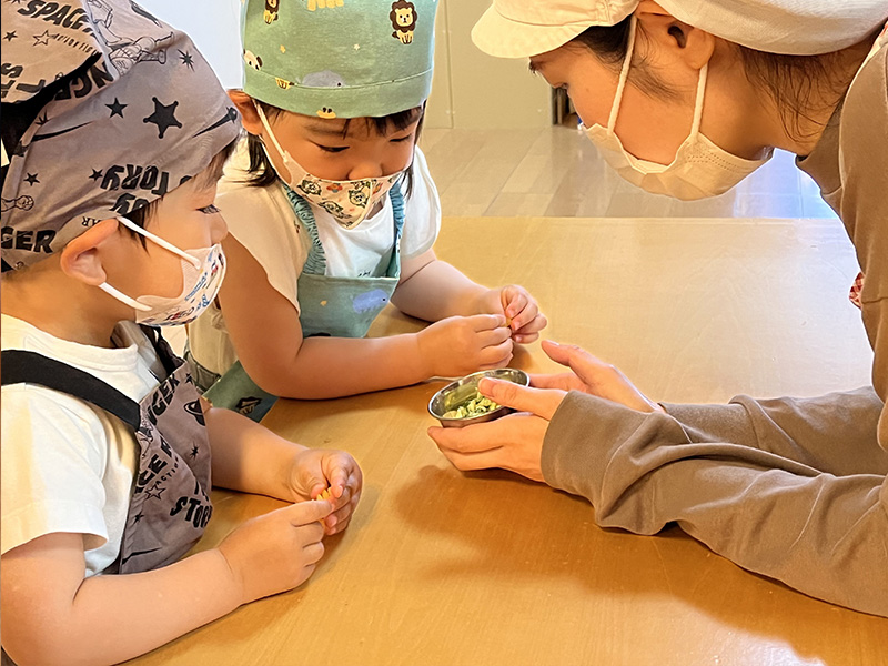 生きること=食の営みであることを、身近に感じ、食べものを大切にする心、作ってくれる人への感謝する気持ち、誰かと一緒に食べる喜びや楽しさなども育めるようにしています。